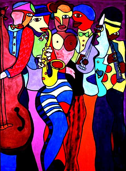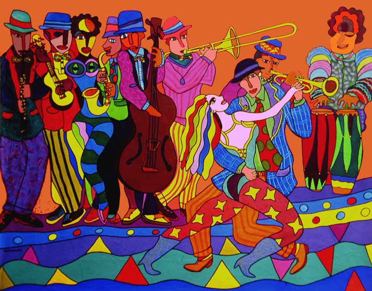 Jazz Band, autre remarquable exemple de l’art de Pedro Uhart, laisse transparaître la concentration des musiciens, et filtrer les rythmes syncopés du jazz entre ses audacieux entrelacs de couleurs et de surlignages.